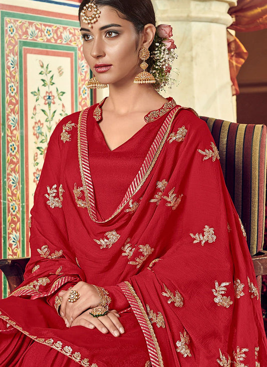 Palazzo Salwar Suit Pashmina Red Embroidered