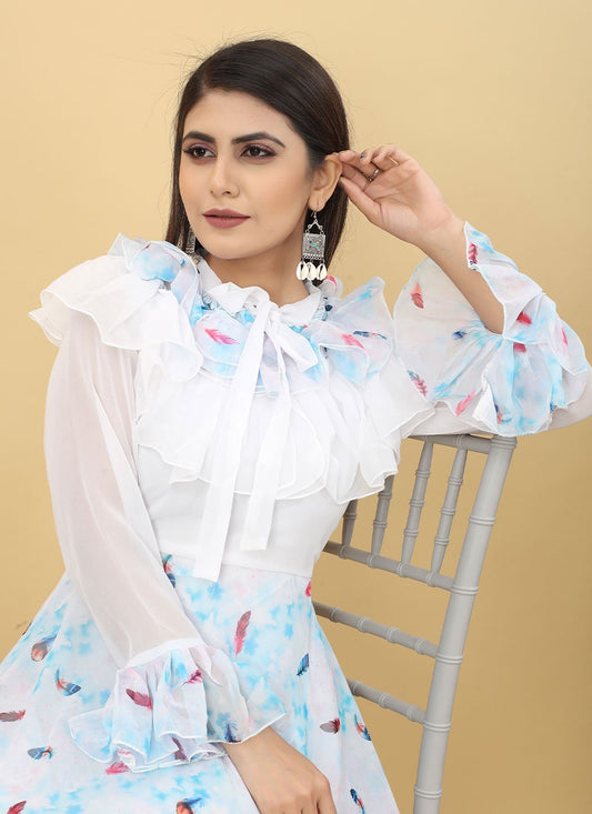 Gown Georgette Aqua Blue White Digital