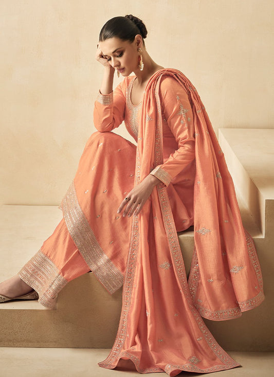 Salwar Suit Silk Orange Embroidered Salwar