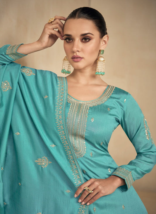 Salwar Suit Silk Turquoise Embroidered Salwar