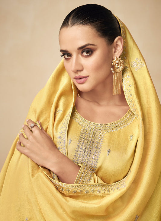 Salwar Suit Silk Yellow Embroidered Salwar
