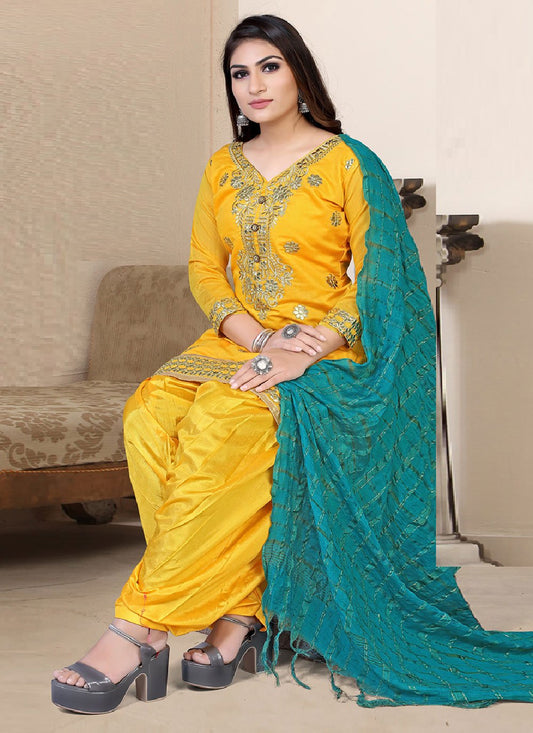 Straight Salwar Suit Chanderi Yellow Embroidered