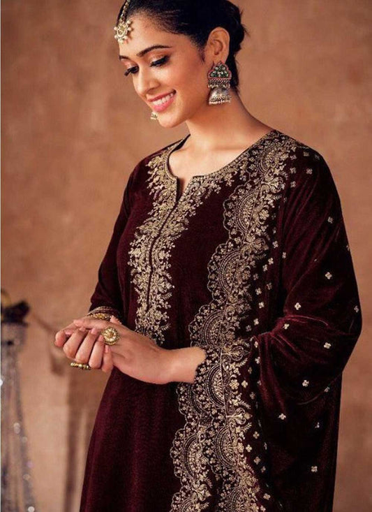 Pant Style Suit Velvet Maroon Embroidered