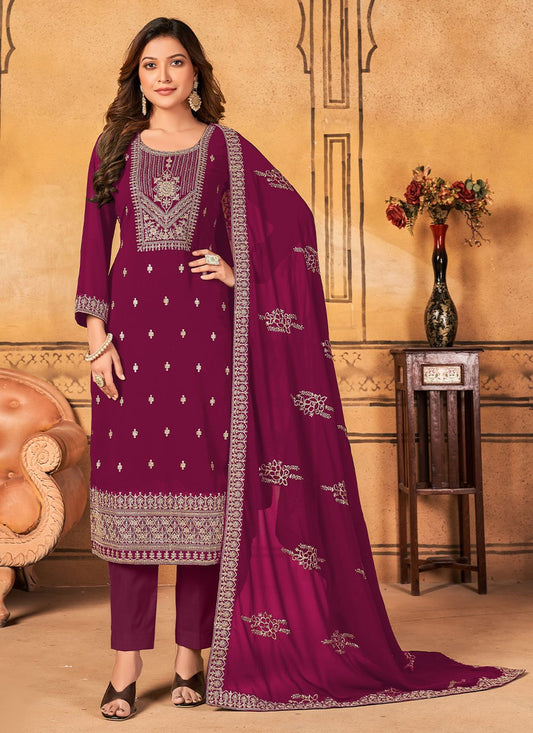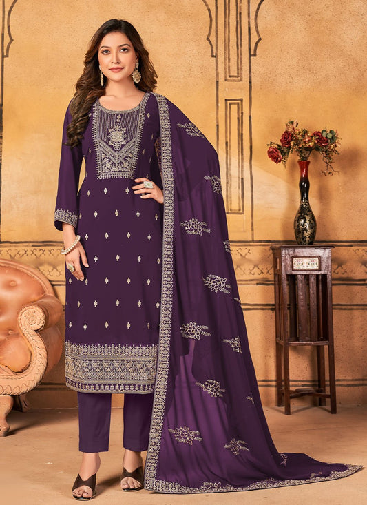 Salwar Suit Faux Georgette Purple Embroidered