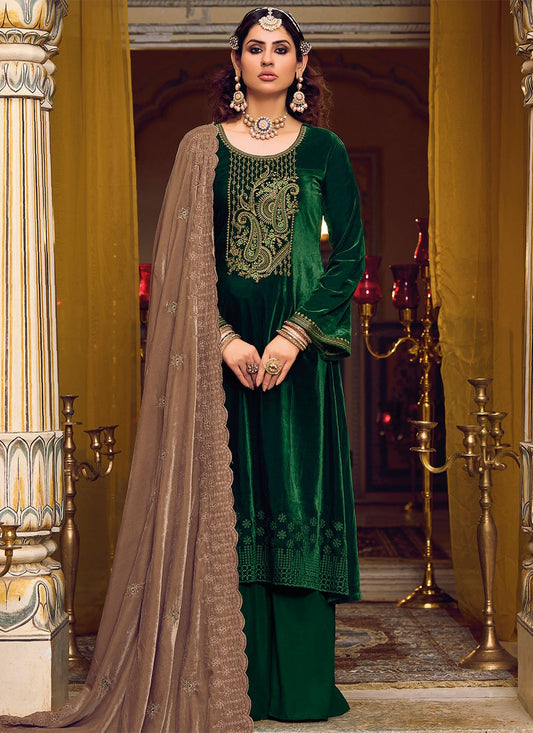 Palazzo Salwar Suit Velvet Green Embroidered