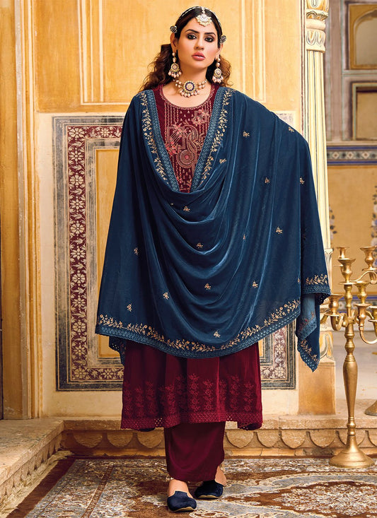 Palazzo Salwar Suit Velvet Maroon Embroidered