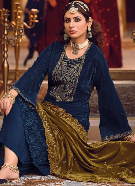Salwar Suit Velvet Blue Embroidered Salwar