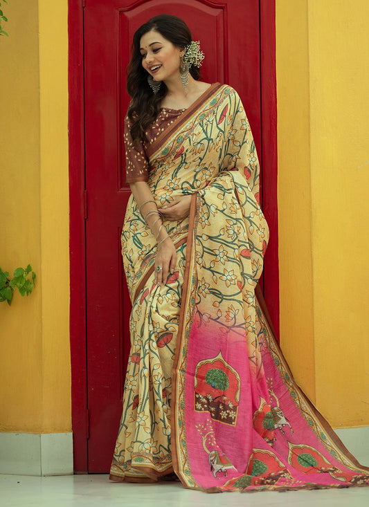 Classic Linen Yellow Digital Print Saree
