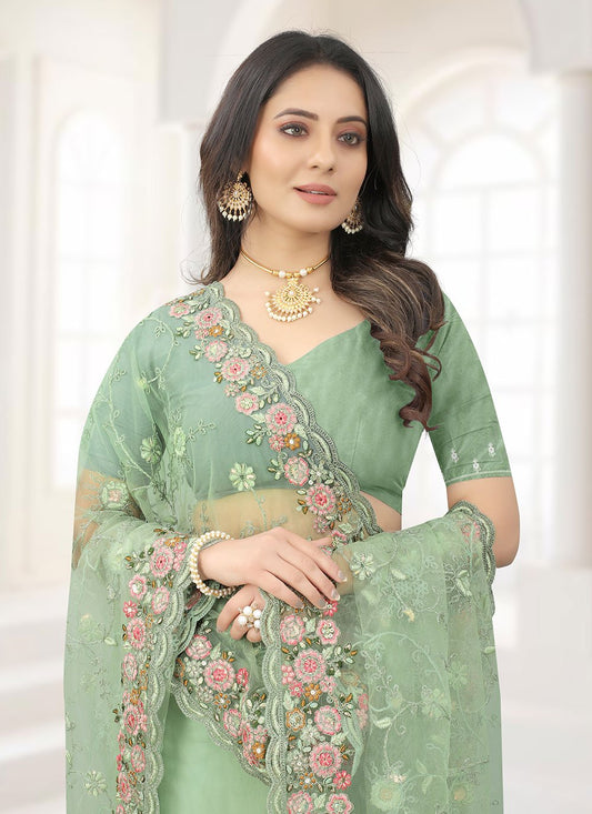 Classic Net Green Embroidered Saree