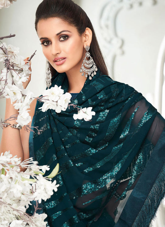 Designer Georgette Teal Fancy Work Saree