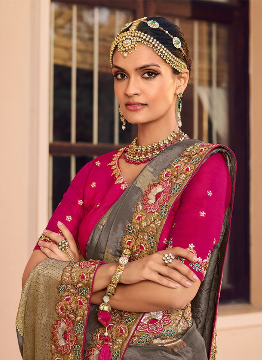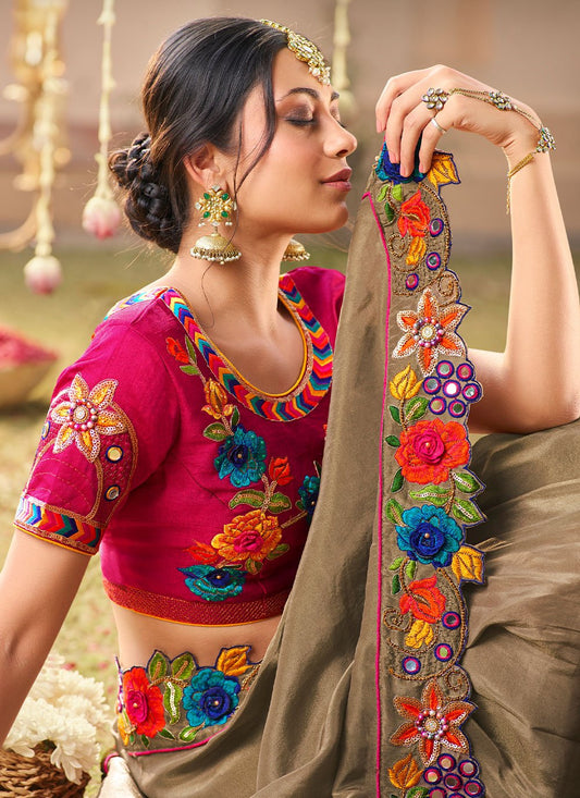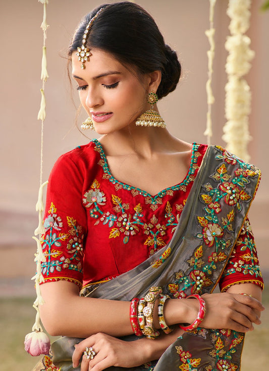 Traditional Saree Organza Grey Hand Work