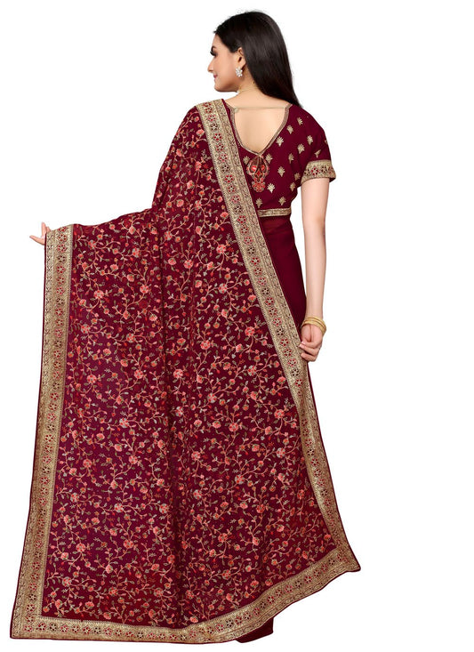 Classic Georgette Maroon Embroidered Saree