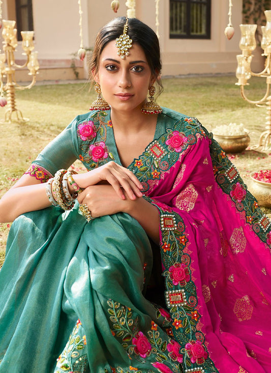 Contemporary Organza Sea Green Embroidered Saree