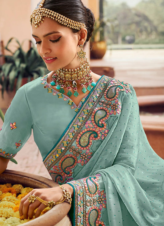 Traditional Saree Silk Aqua Blue Embroidered