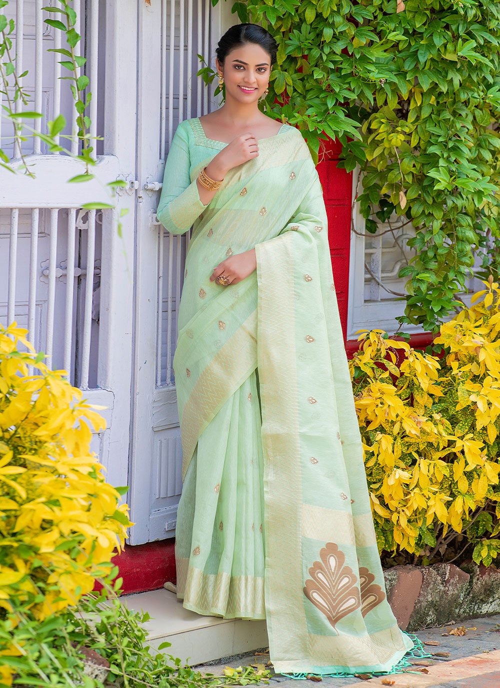 Bring out the true diva in you and reinvent your true self. Be your own style icon with captivating green linen and tissue saree. The brilliant attire creates a dramatic canvas with amazing woven and zari work. Comes with matching blouse. (Slight variation in color, fabric & work is possible. Model images are only representative.)