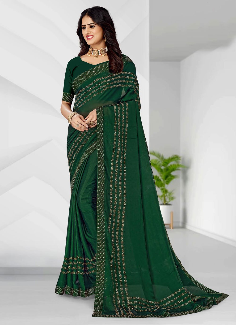 Precise splendor comes out as a result of the dressing style and design with this green satin saree. This pretty attire is displaying some unbelievable embroidery done with embroidered work. Comes with matching blouse. (Slight variation in color, fabric & work is possible. Model images are only representative.)