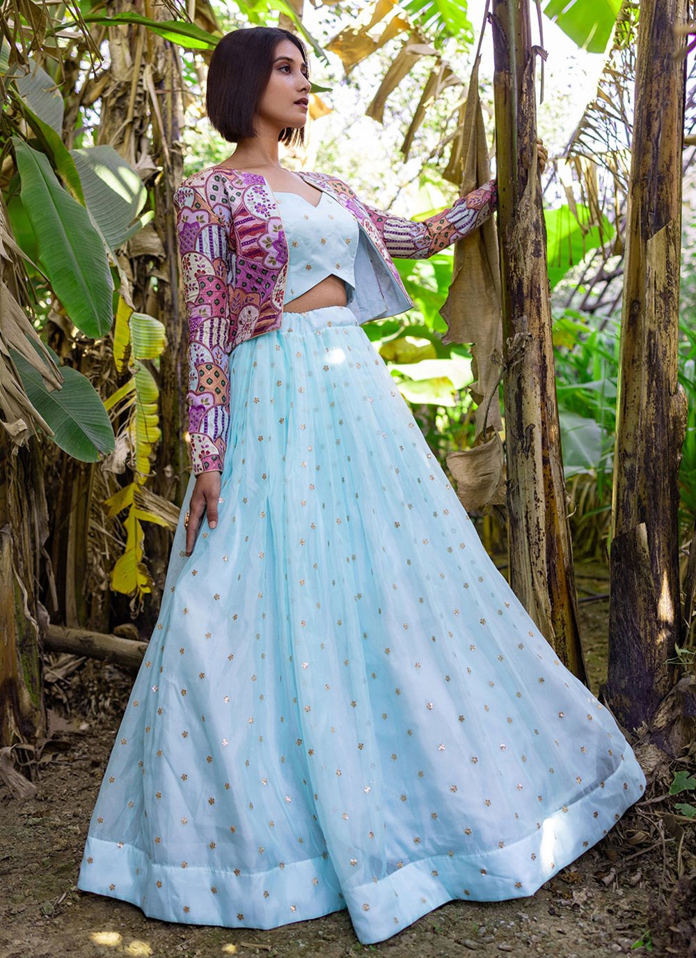 You look so charming wearing this attire. Make the heads turn the moment you dress up with this wonderful aqua blue organza a line lehenga choli. The embroidered and resham work looks chic and ideal for any affair. Comes with matching choli and dupatta. (Slight variation in color, fabric & work is possible. Model images are only representative.)