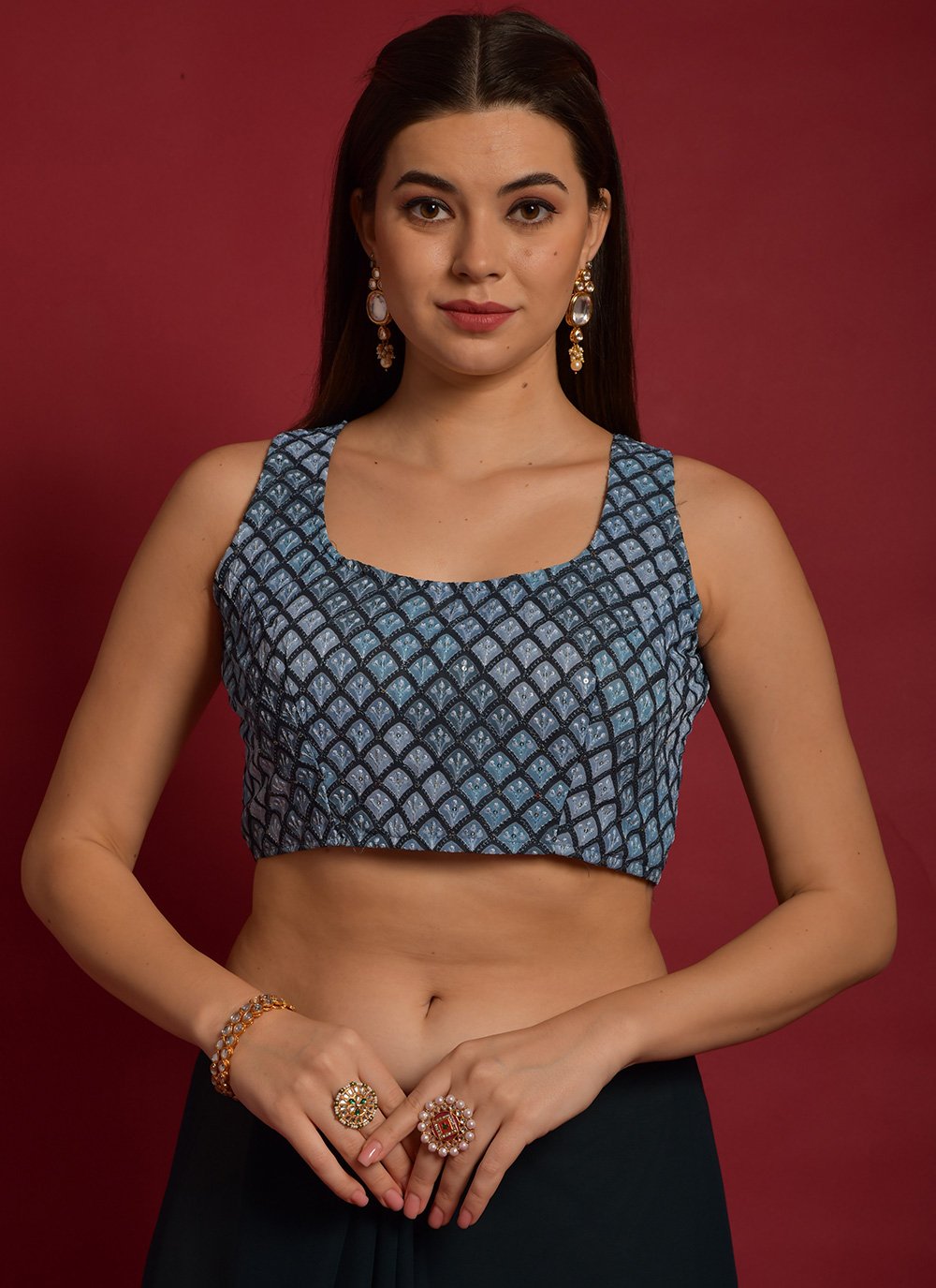 Stay ahead of the current trend just by stepping out in this blue color satin fabric ready made blouse. Beautify with embroidered and printed work at all over.Accessories shown in the image are for presentation purposes only. (Slight variation in the actual color vs. Image is possible).