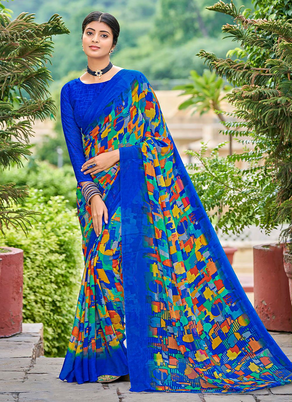 Rich look attire to give your a right choice for any party or function. We unfurl our the intricacy and exclusivity of our creations highlighted in this lovely multi colour faux chiffon casual saree. This beautiful attire is showing some amazing embroidery done with printed work. Comes with matching blouse. (Slight variation in color, fabric & work is possible. Model images are only representative.)