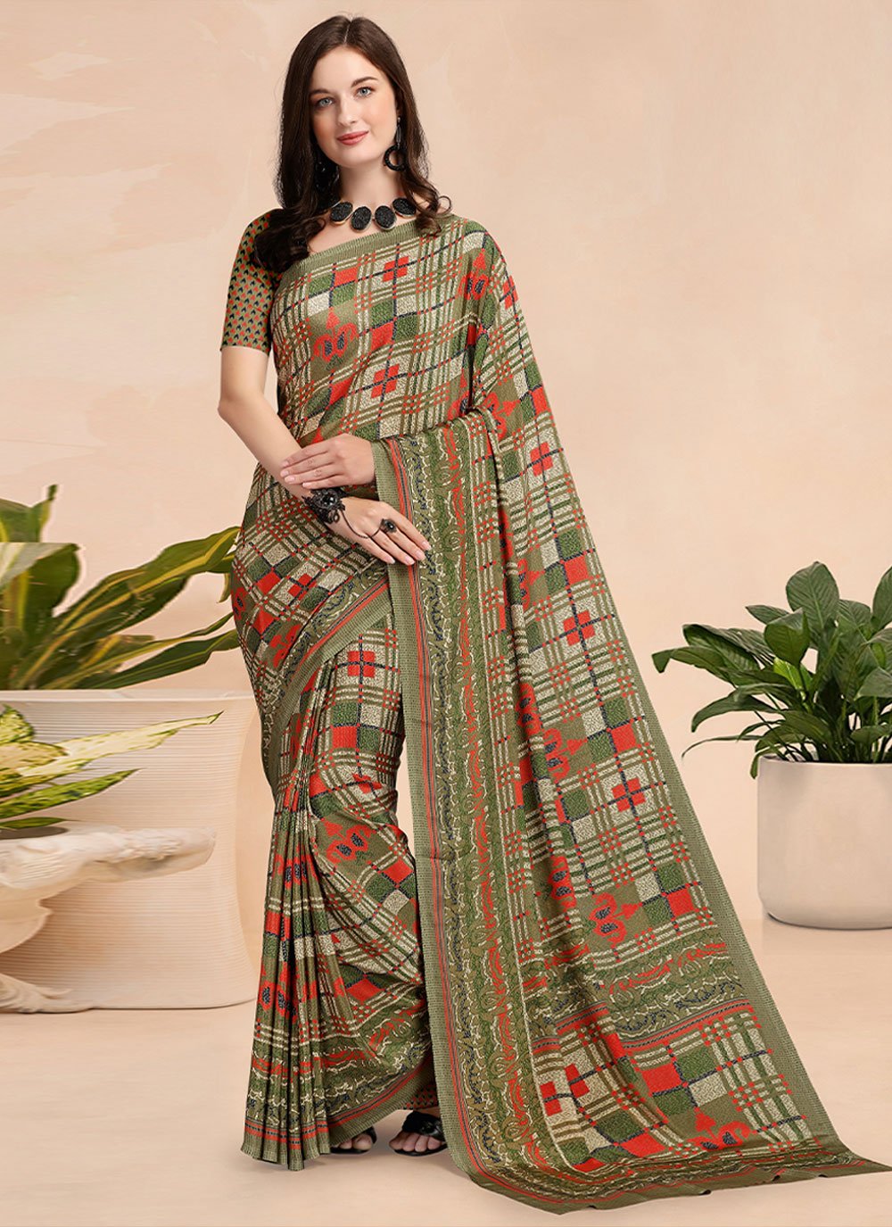 Ravishing attire to enhance your beauty. Make an adorable statement in this smashy multi colour faux crepe casual saree. The printed work looks chic and perfect for any occasion. Comes with matching blouse. (Slight variation in color, fabric & work is possible. Model images are only representative.)