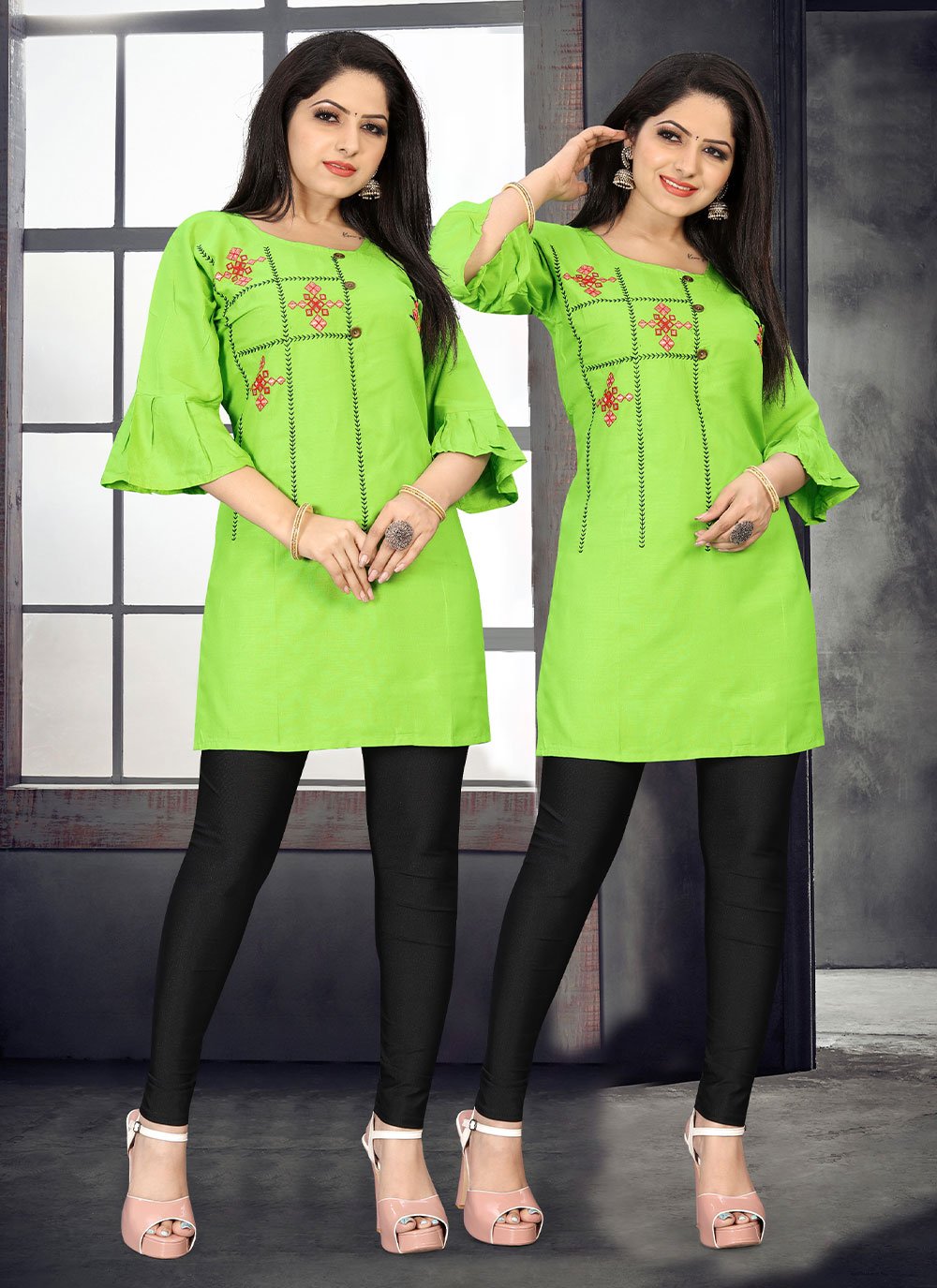 Style and trend will be at the peak of your beauty when you attire this green rayon casual kurti. You can see some interesting patterns carried out with embroidered work. (Slight variation in color, fabric & work is possible. Model images are only representative.