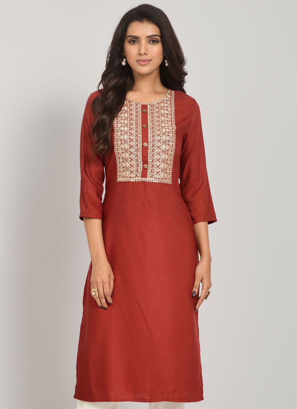 Be an angel and create and establish a smashing impression on for every person by carrying this maroon rayon casual kurti. The interesting embroidered work a considerable attribute of this attire. (Slight variation in color, fabric & work is possible. Model images are only representative.)
