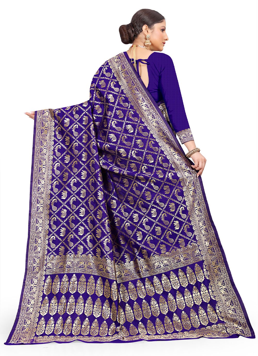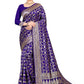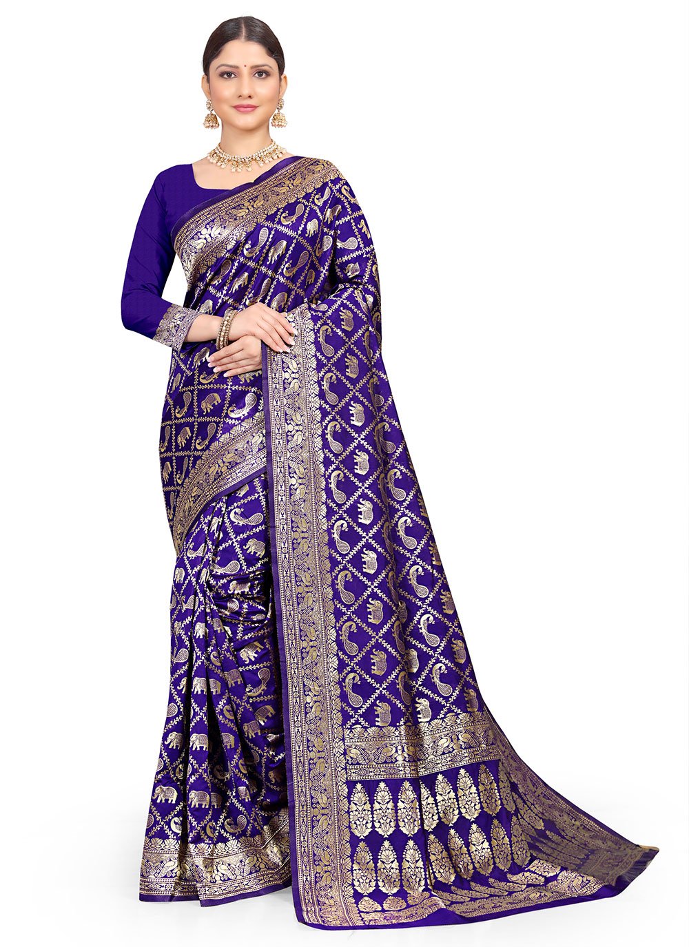 If you are a diva who loves to turn heads wherever you go and this delightful drape is a must have item for your closet. Style and design and pattern could be at the peak of your elegance when you dresses this violet art silk classic saree. The ethnic weaving work to the attire adds a sign of beauty statement for your look. Comes with matching blouse. (Slight variation in color, fabric & work is possible. Model images are only representative.)