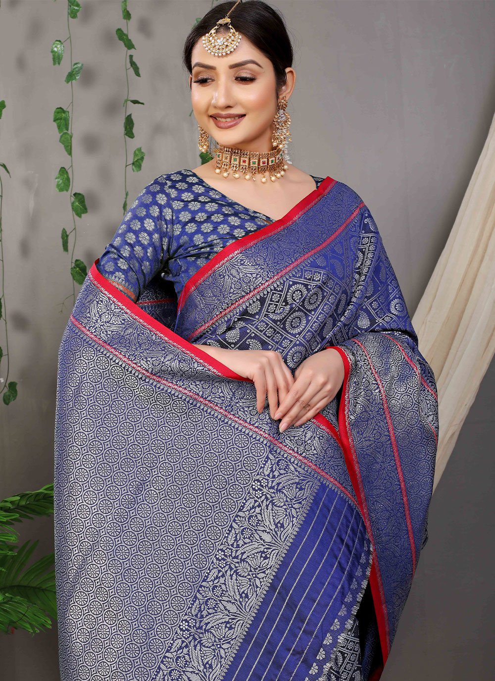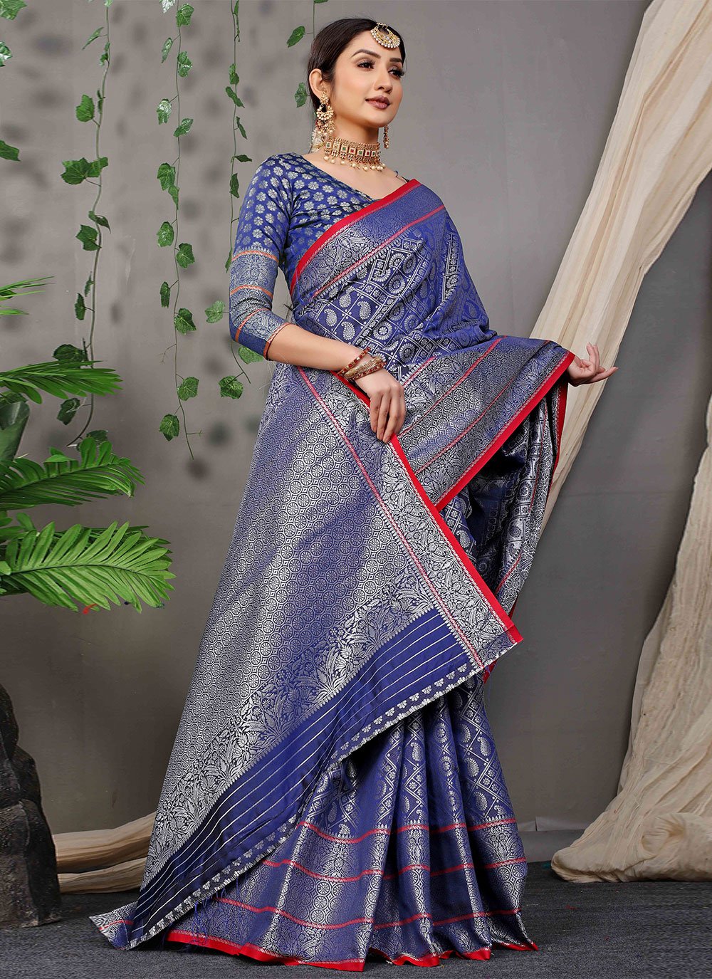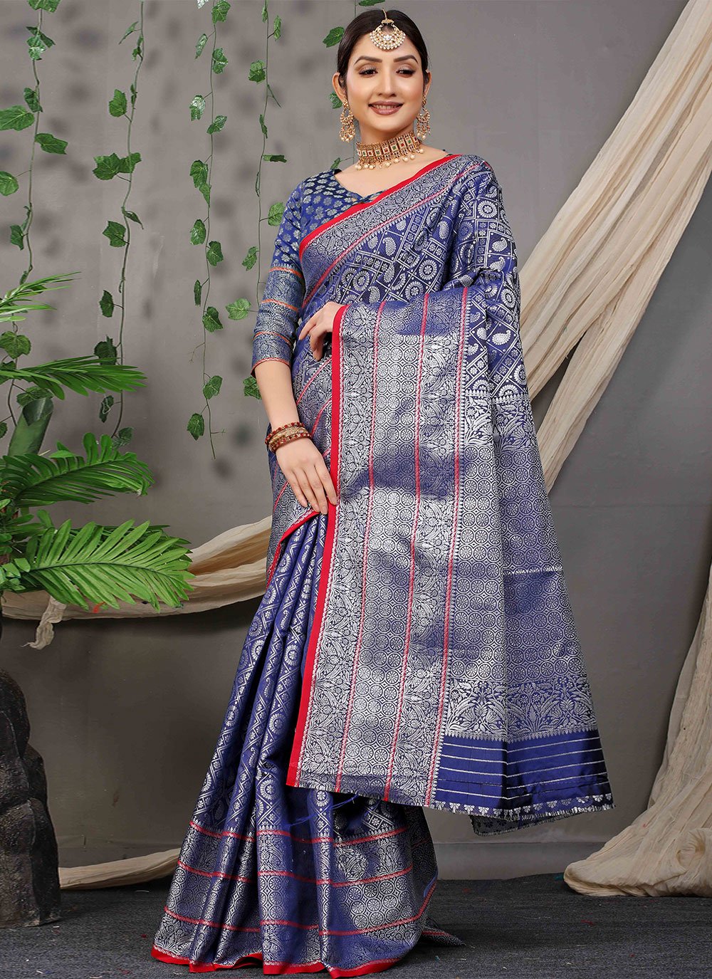 Be an angel and create and ascertain a smashing impact on everybody by carrying this blue banarasi silk classic saree. The pretty jacquard work work all through the attire is awe inspiring. Comes with matching blouse. (Slight variation in color, fabric & work is possible. Model images are only representative.)