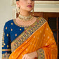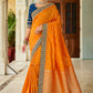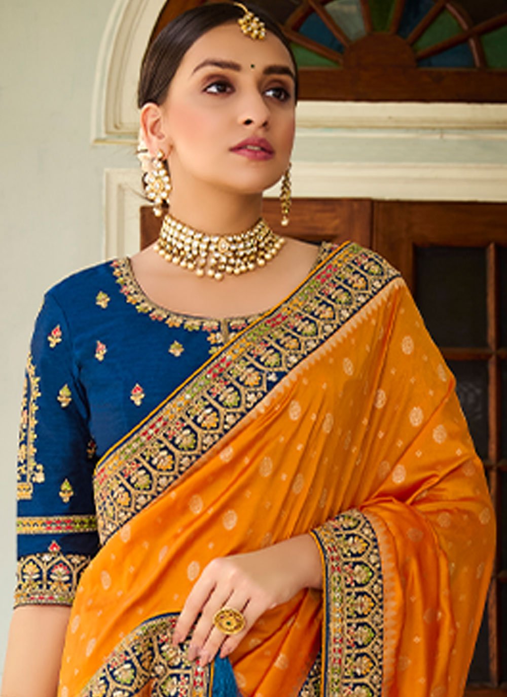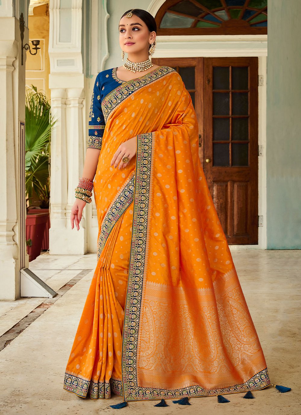 Famous designers tend to give reign to their imagination and create clothes that look interesting and guided by the desire to attract attention. Look stunningly beautiful in this orange banarasi silk saree. It has been beautifully designed with weaving work. Comes with matching blouse. (Slight variation in color, fabric & work is possible. Model images are only representative.)