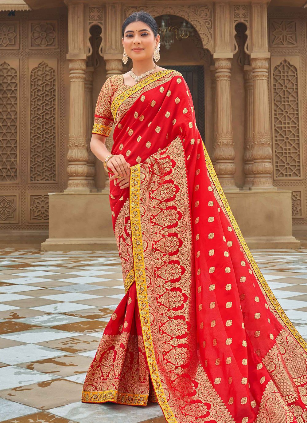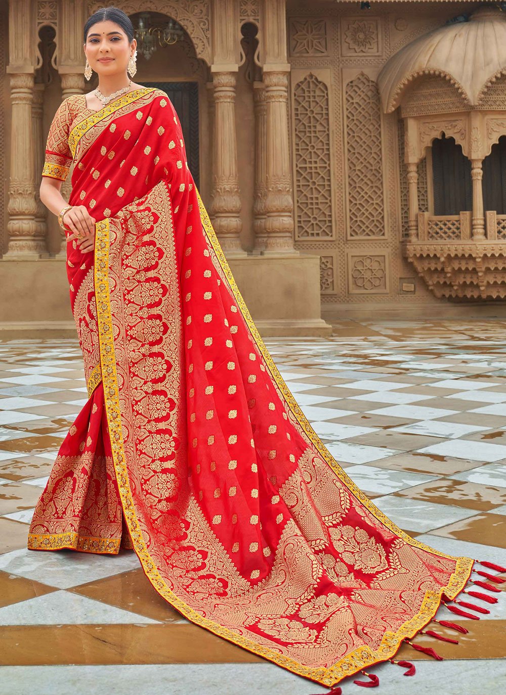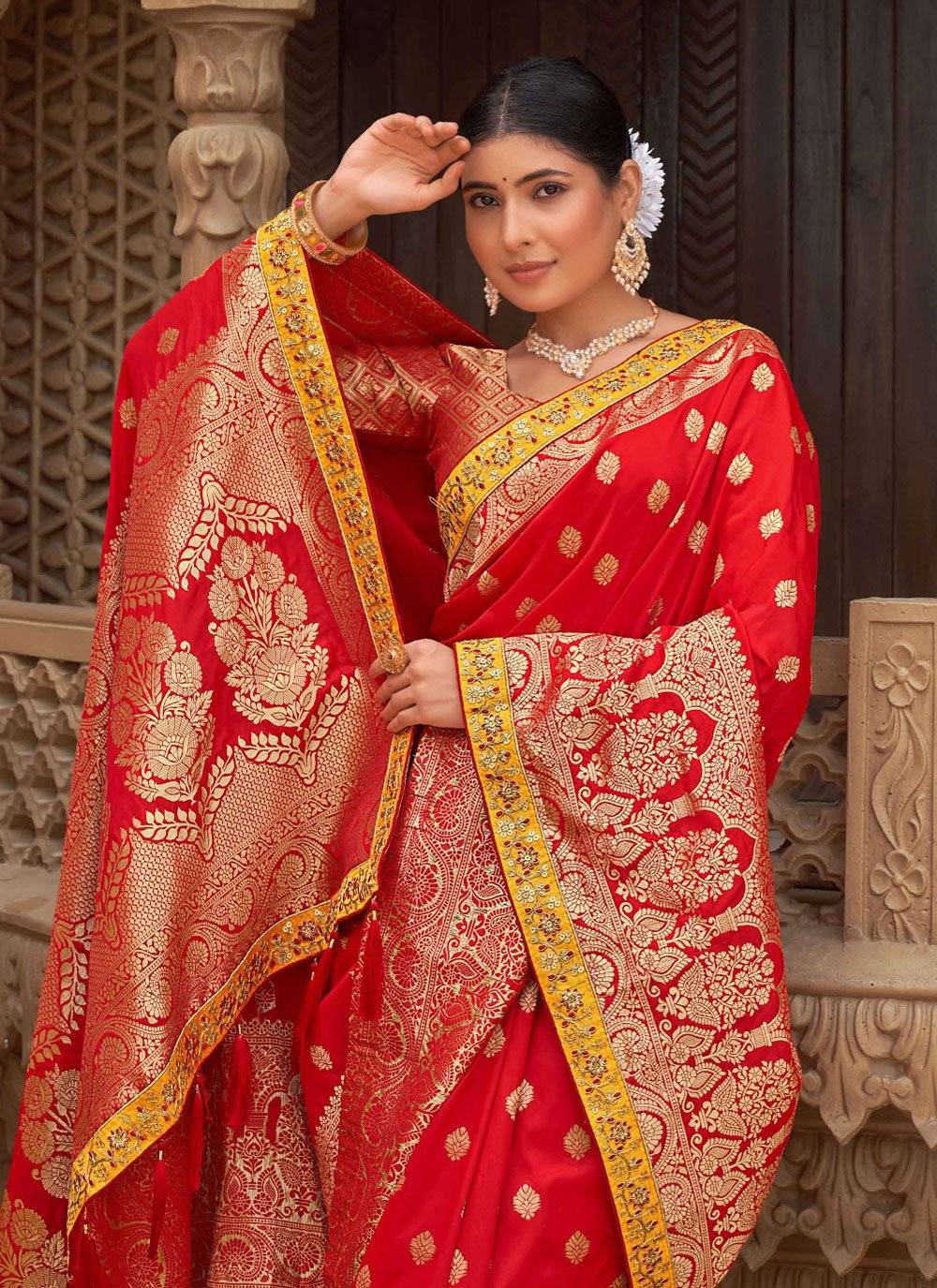 Design and trend will be at the peak of your magnificence after you dresses this red banarasi silk classic saree. This dress is beautifully adorned with weaving work. Comes with matching blouse. (Slight variation in color, fabric & work is possible. Model images are only representative.)