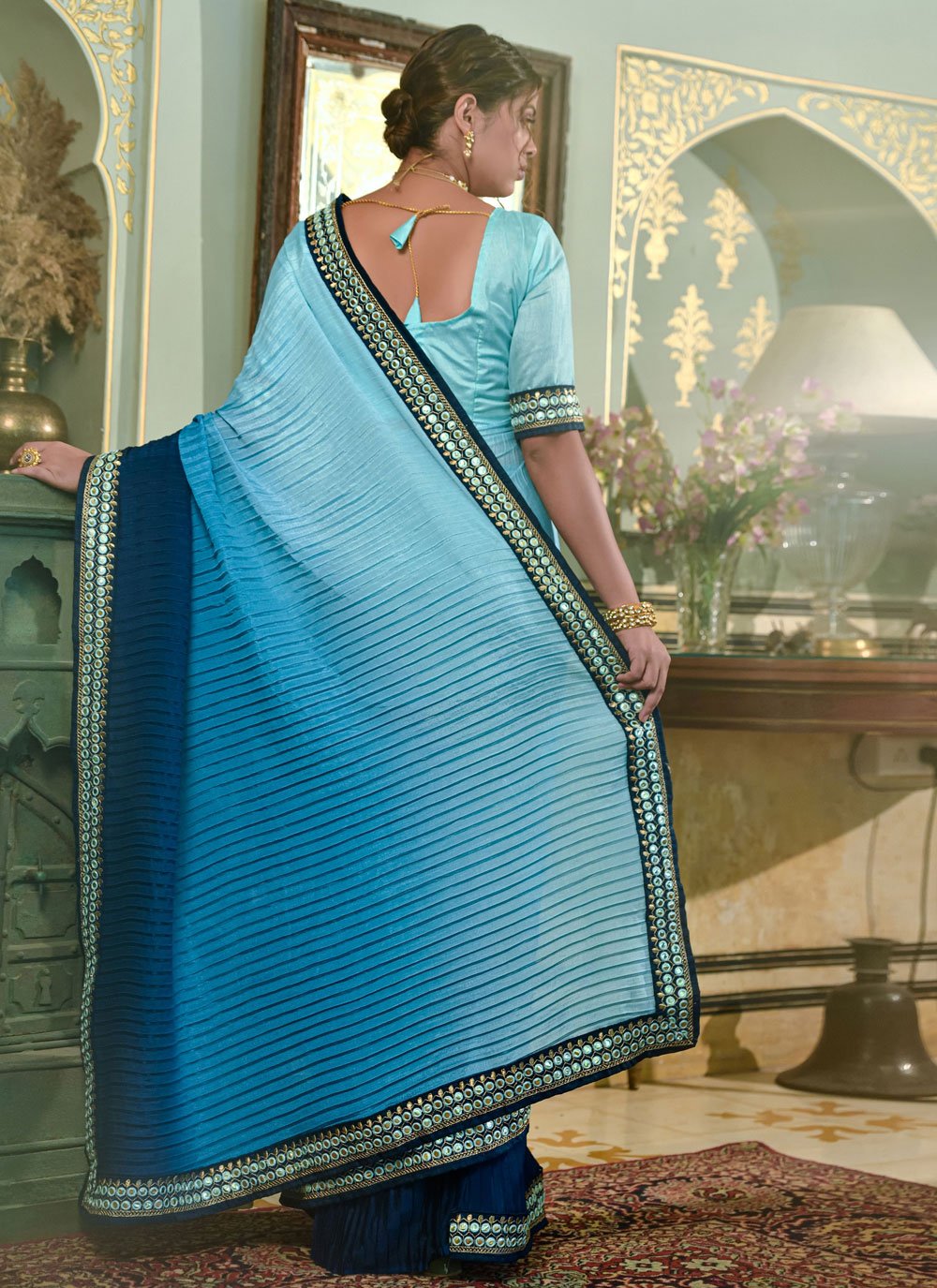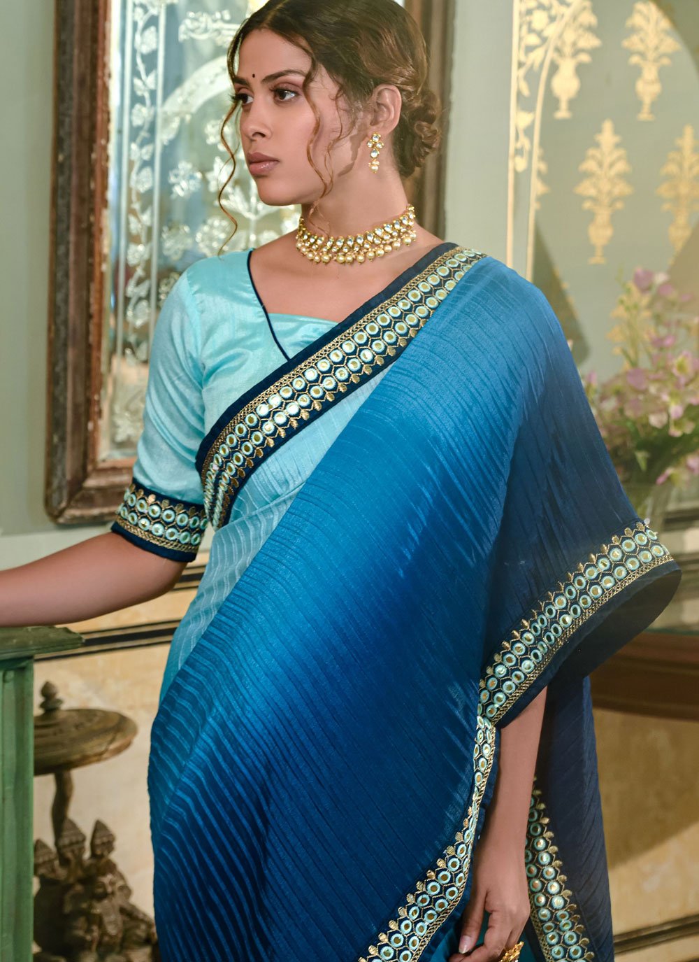 This season your look gets better definition with just a little attention to detail. Look stunningly beautiful in this blue chinon saree. Beautified and stylized with embroidered and lace work to give you an attractive look. Comes with matching blouse. (Slight variation in color, fabric & work is possible. Model images are only representative.)