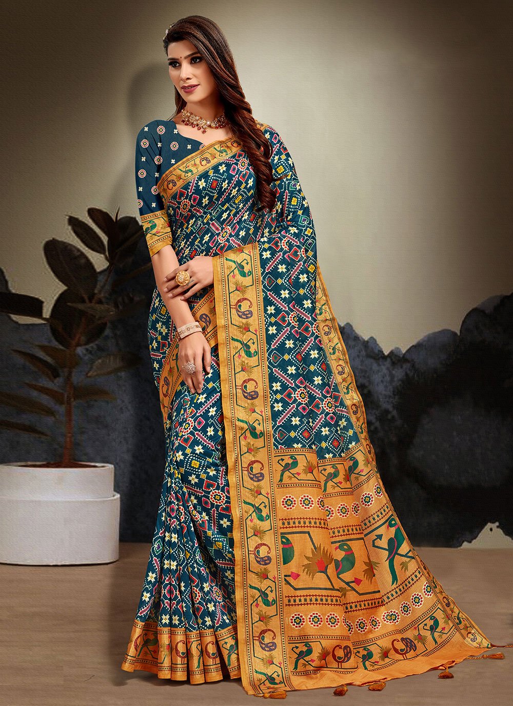 This brilliant array will make you the ultimate classic beauty at the next event you attend. Make the heads turn when you dress up in this charming blue cotton classic saree. This attire is showing some really mesmerizing and innovative patterns embroidered with printed work. Comes with matching blouse. (Slight variation in color, fabric & work is possible. Model images are only representative.)