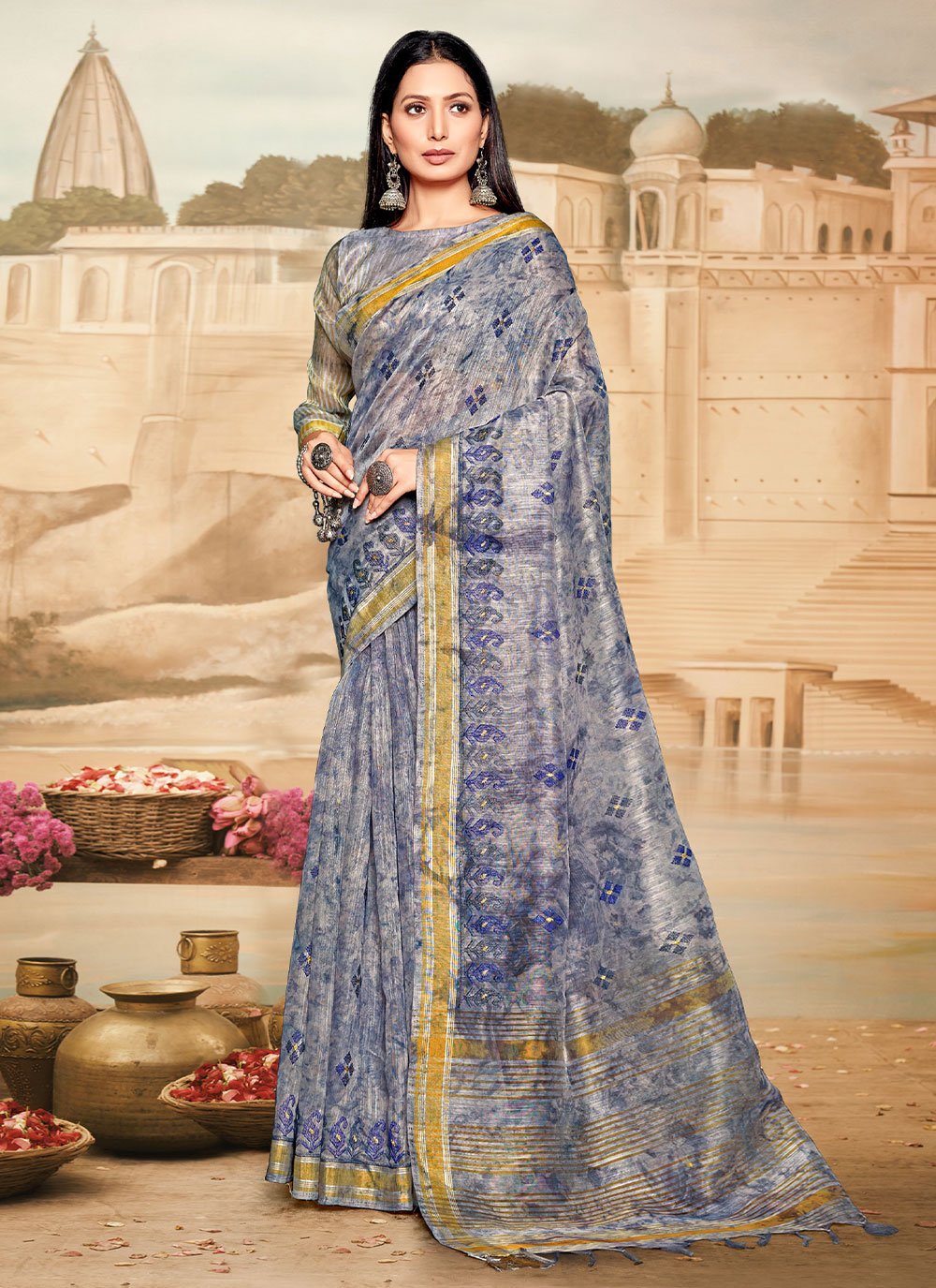 Ravishing attire to enhance your beauty. Be your own style diva with this blue cotton and linen saree. This lovely attire is looking extra beautiful with embelishment of embroidered and printed work. Comes with matching blouse. (Slight variation in color, fabric & work is possible. Model images are only representative.)