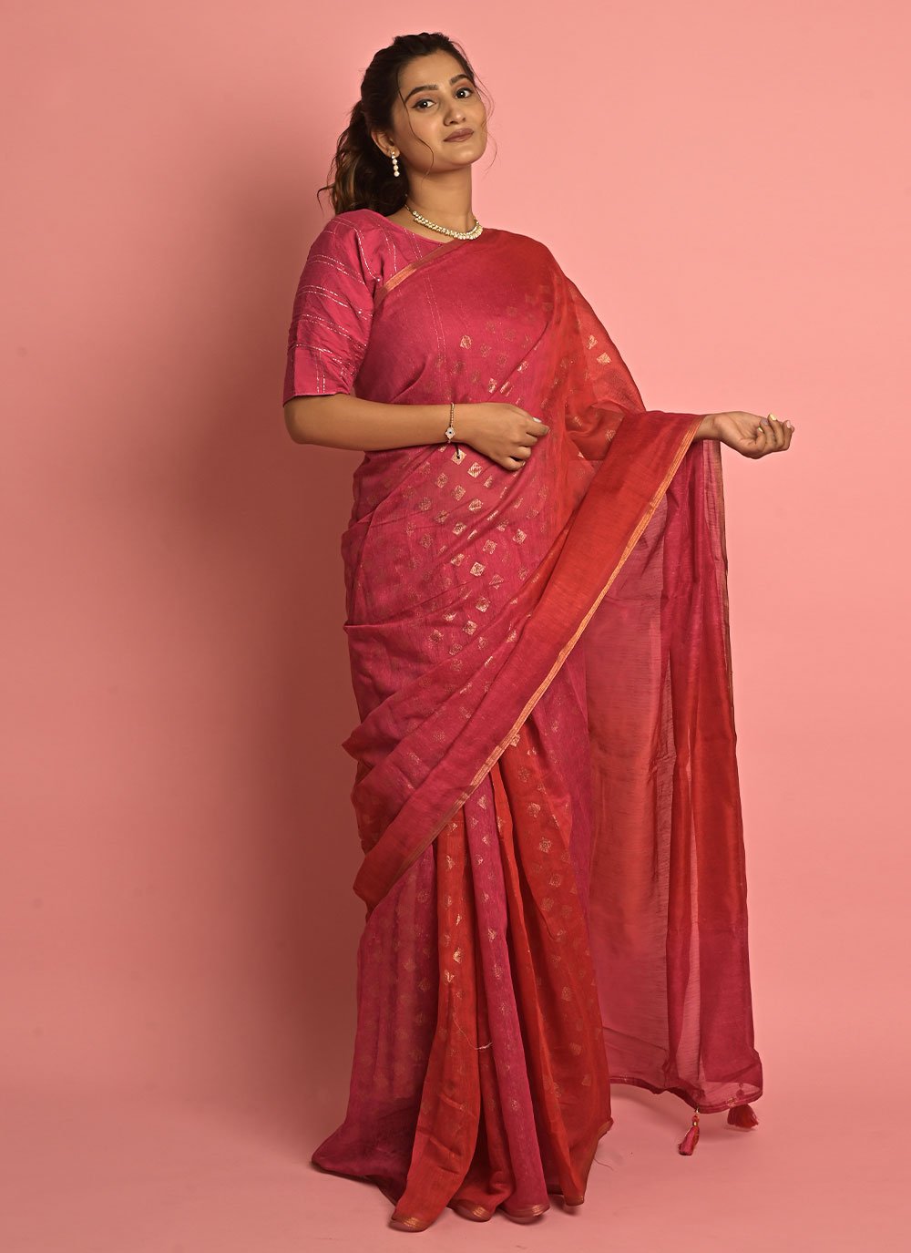 Rich look attire to give your a right choice for any party or function. Be the center of attraction with this pink cotton saree. This ravishing attire is amazingly embroidered with fancy work. Comes with matching blouse. (Slight variation in color, fabric & work is possible. Model images are only representative.)