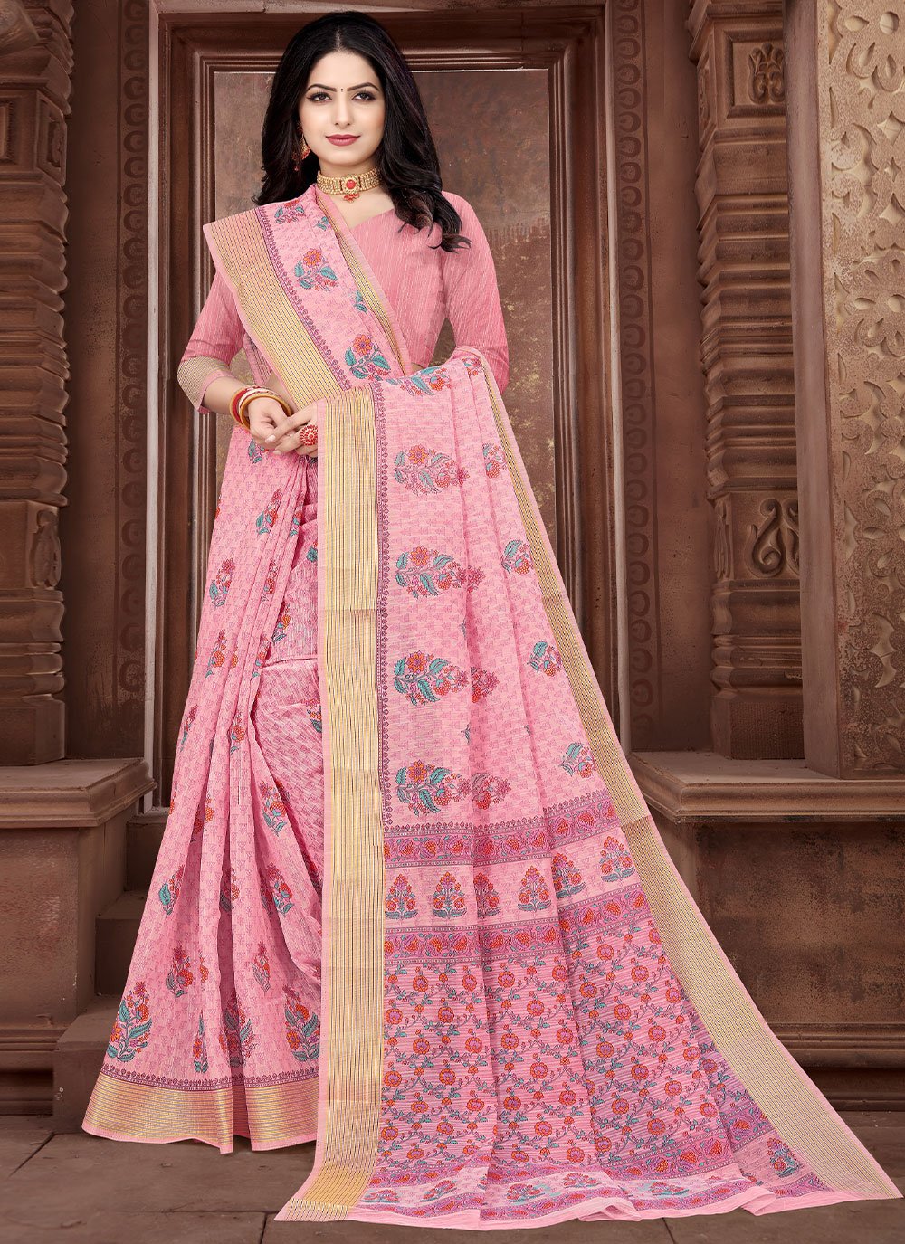 This pink cotton classic saree add the sense of elegant and glamorous. The ethnic printed work within the dress adds a sign of beauty statement for the look. Comes with matching blouse. (Slight variation in color, fabric & work is possible. Model images are only representative.)