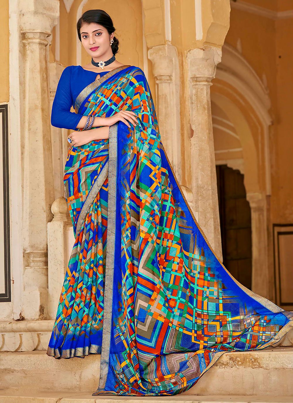 Grab the second look in this elegant attire for this season. This multi colour faux chiffon classic saree add the sense of elegant and glamorous. The brilliant attire creates a dramatic canvas with amazing printed work. Comes with matching blouse. (Slight variation in color, fabric & work is possible. Model images are only representative.)