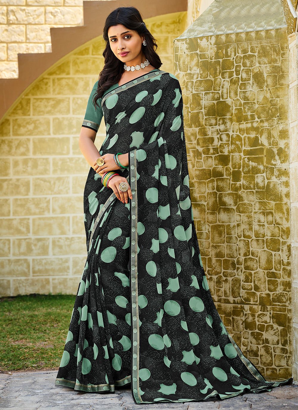 Make the heads turn after you costume up in this attractive black georgette classic saree. The lovely border, fancy and printed work throughout the dress is awe inspiring. Comes with matching blouse. (Slight variation in color, fabric & work is possible. Model images are only representative.)