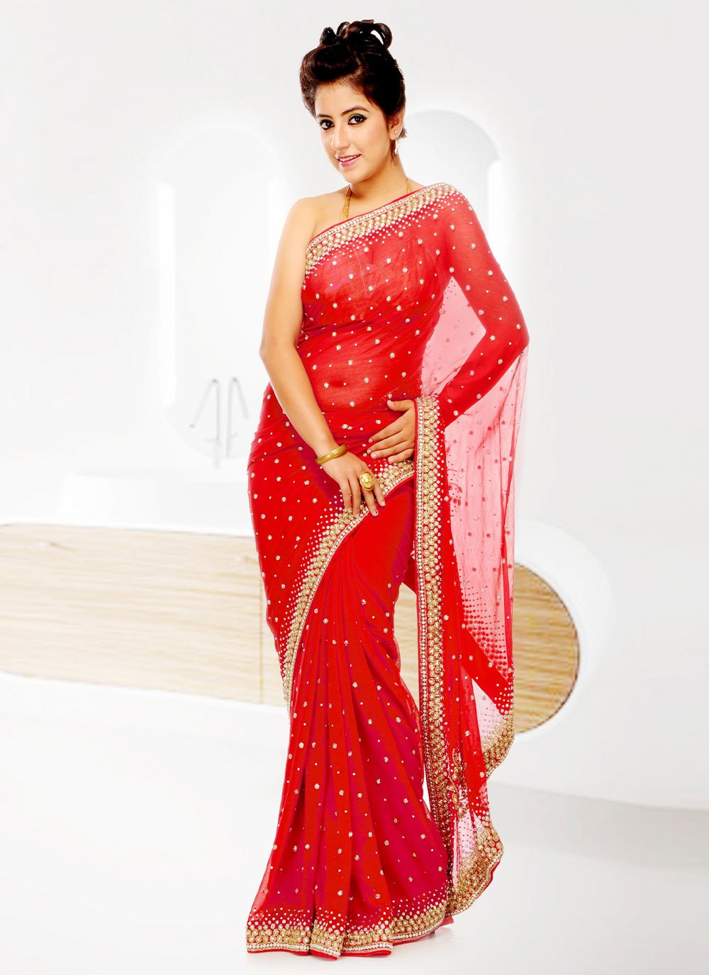 Make the heads turn whenever you costume up in such a stunning red georgette classic saree.. The handwork work seems chic and great for any party. Comes with matching blouse. (Slight variation in color, fabric & work is possible. Model images are only representative.)