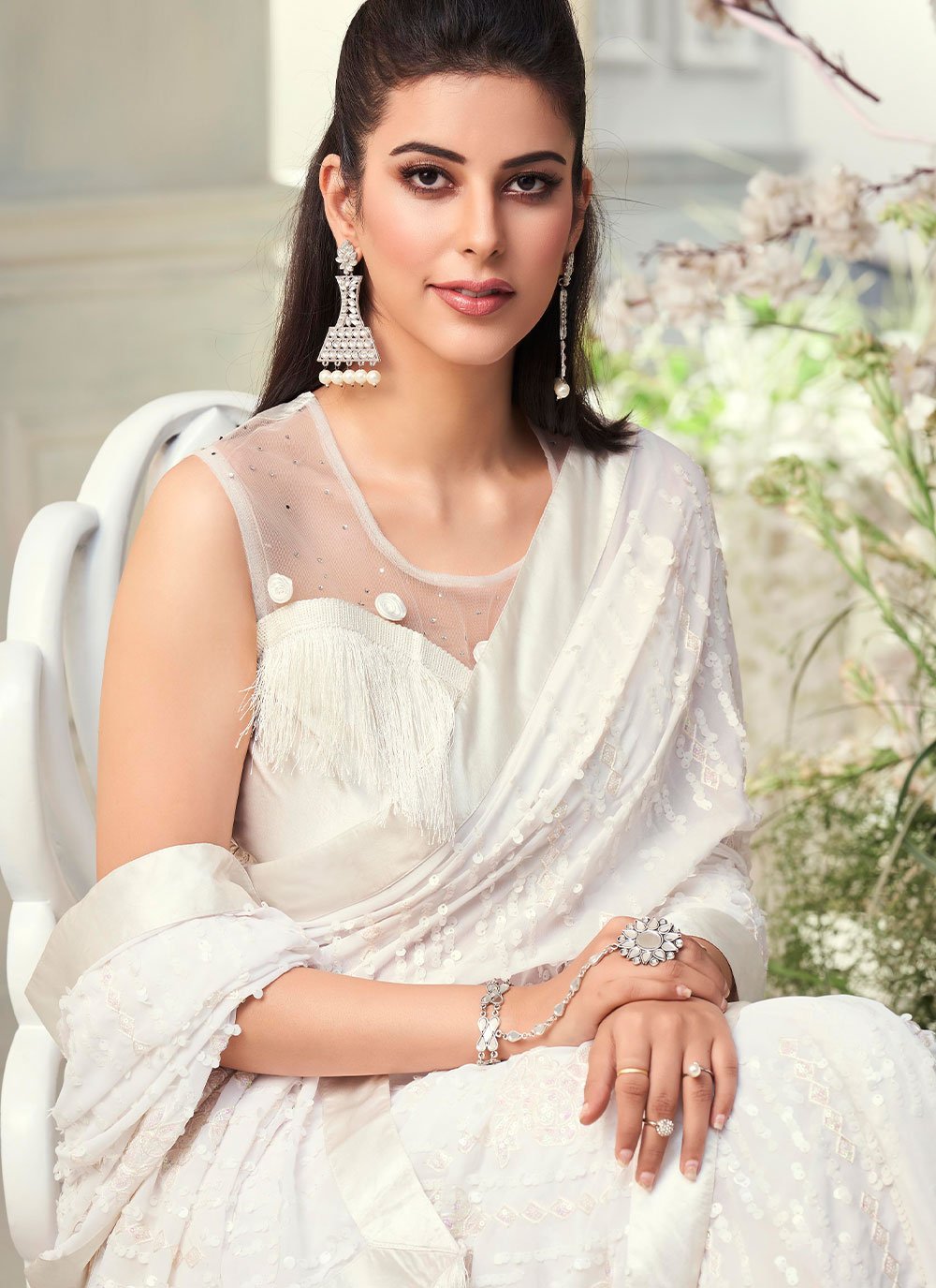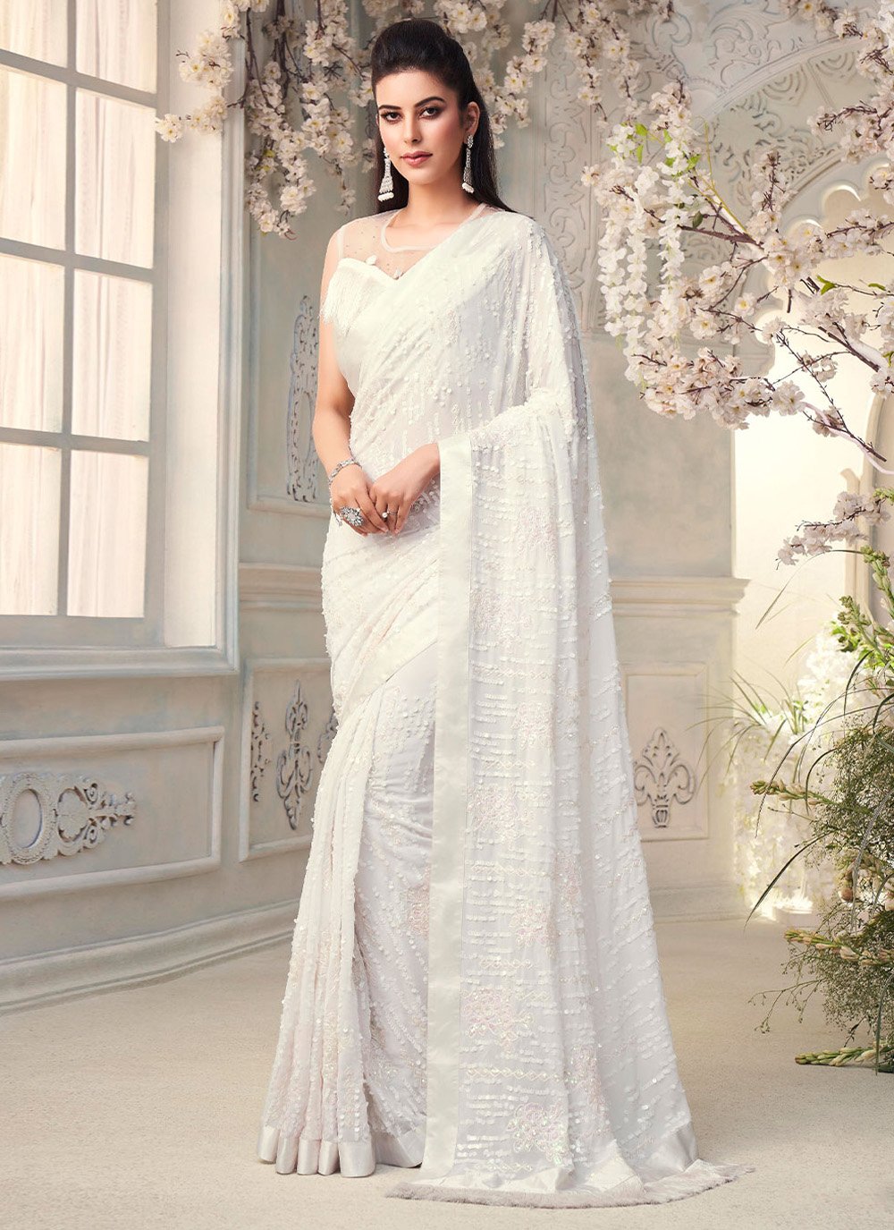 Get going with this majestic and wonderful piece and make your dream attire look richer to your persona. Add the sense of feminine beauty by this white georgette classic saree. This attire is nicely designed with fancy work. Comes with matching blouse. (Slight variation in color, fabric & work is possible. Model images are only representative.)
