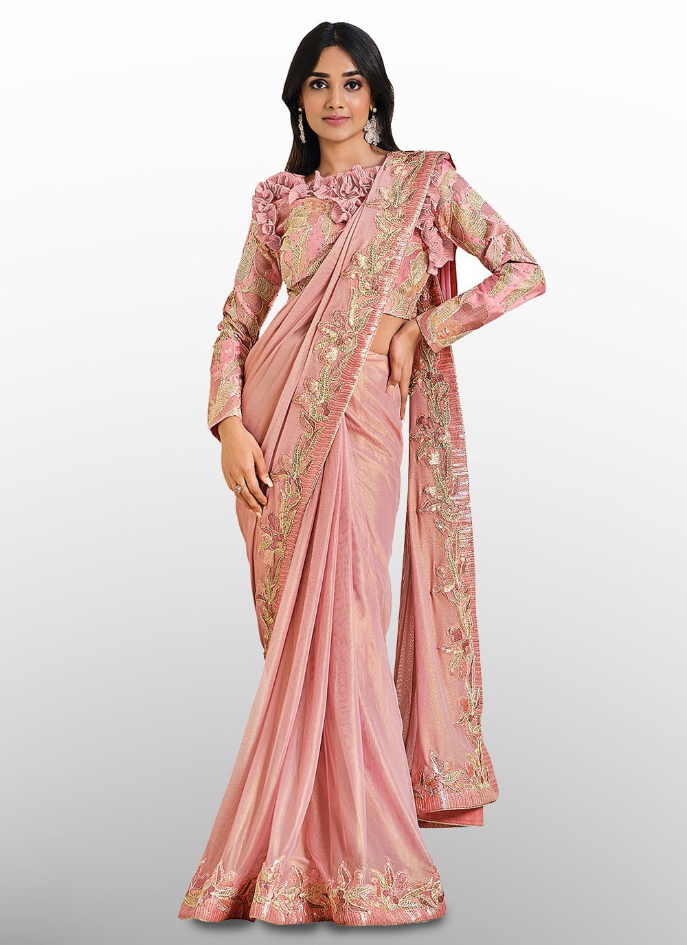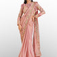 Grab the second look in this elegant attire for this season. Be your own style icon with captivating peach lycra and net saree. The ethnic embroidered and sequins work on the attire adds a sign of beauty statement to your look. Comes with matching blouse. (Slight variation in color, fabric & work is possible. Model images are only representative.)