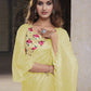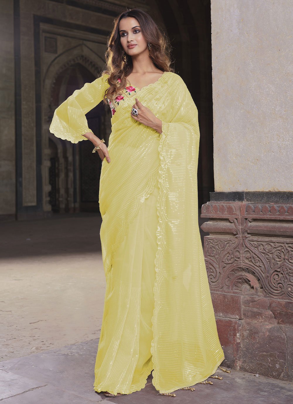 Capture the exuberance of womanhood in its full glory that will bring out your fragility and femininity. Be ready to slip in the comfort zone of yellow net classic saree. The sequins work personifies the entire appearance. Comes with matching blouse. (Slight variation in color, fabric & work is possible. Model images are only representative.)