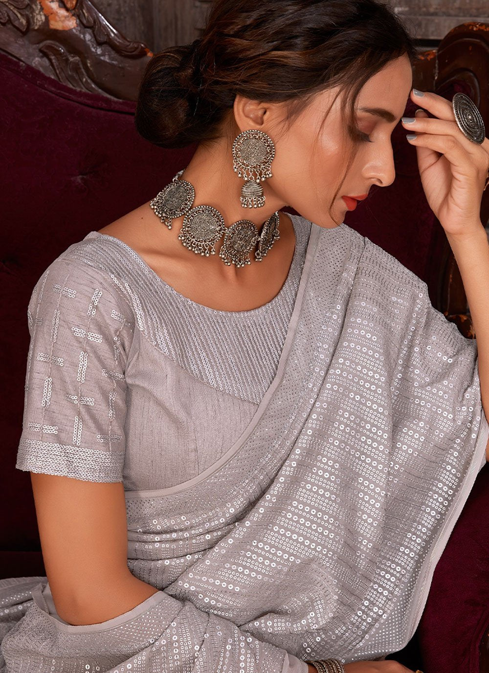 Classic Organza Grey Embroidered Saree