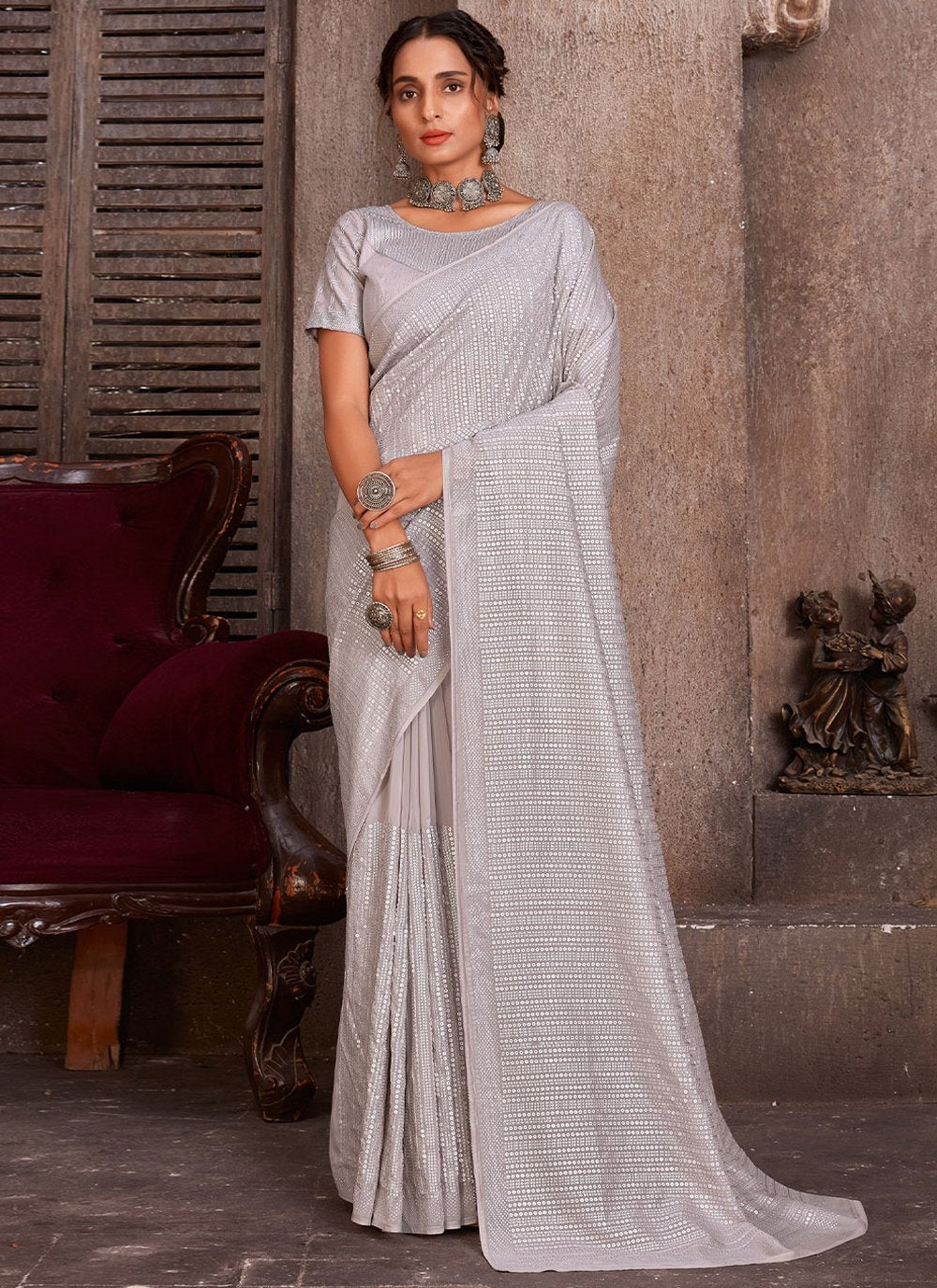 We have ensemble a symphony of enchanting piece to restyle your senses. Make an adorable statement in such a smashy grey organza classic saree. This desirable attire is showing some remarkable embroidery done with embroidered and sequins work. Comes with matching blouse. (Slight variation in color, fabric & work is possible. Model images are only representative.)