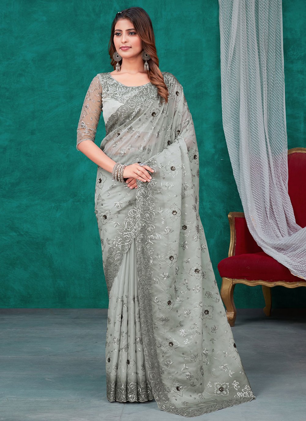 Classic Organza Grey Embroidered Saree