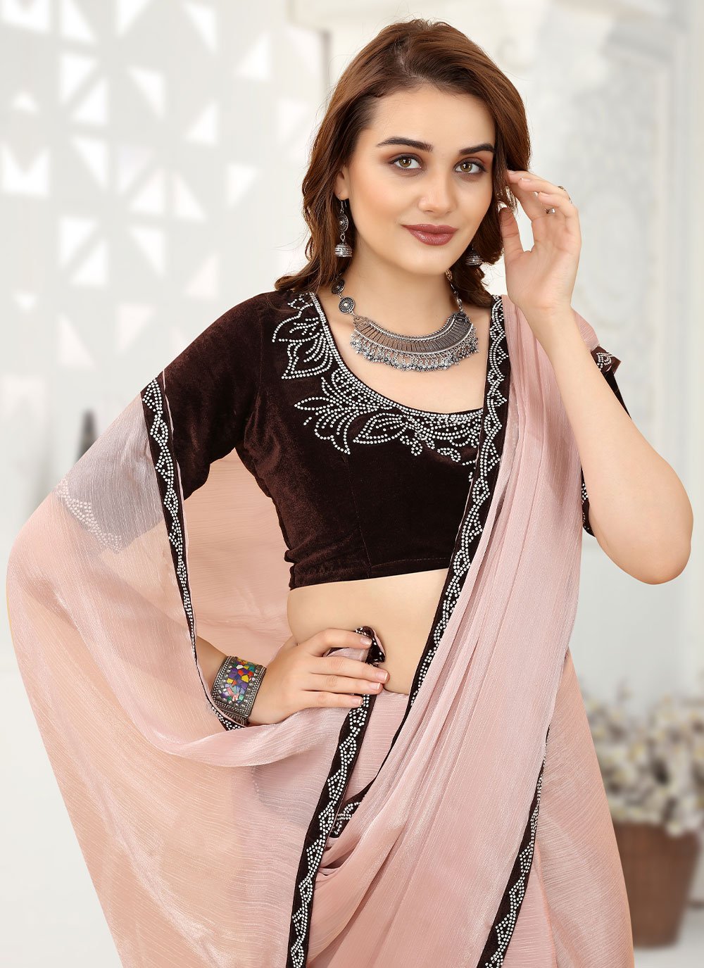 Aspiring to make a mark in the world of style, here is the attire to breath life into your aspirations. Steal the hearts away with this pink organza classic saree. This attire is showing some really mesmerizing and innovative patterns embroidered with lace work. Comes with matching blouse. (Slight variation in color, fabric & work is possible. Model images are only representative.)
