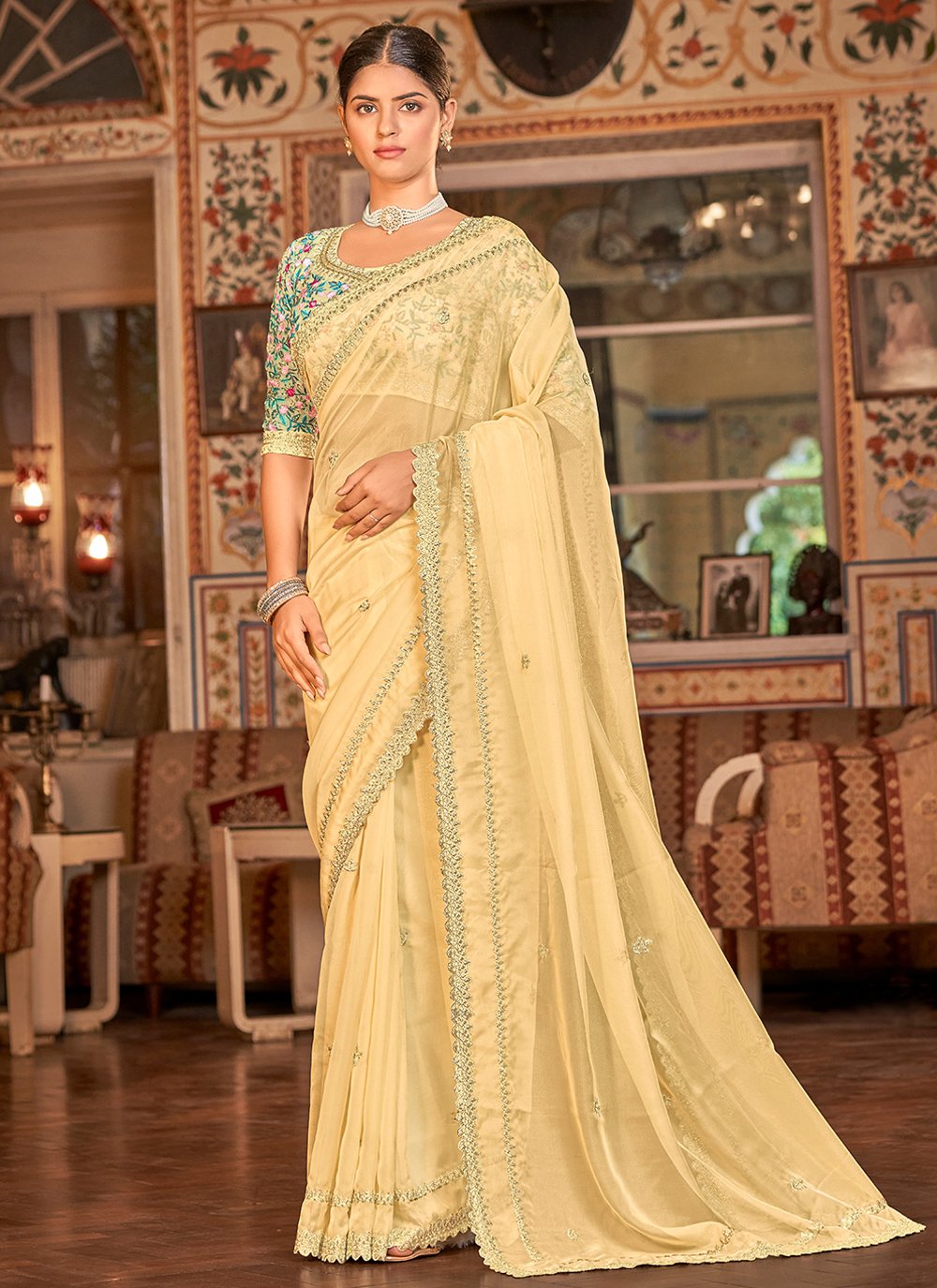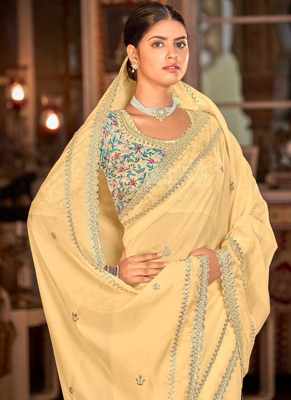 Appear ethnic with this affluent yellow organza saree. This dress is showing some really mesmerizing and imaginative patterns embroidered with thread and zari work. Comes with matching blouse. (Slight variation in color, fabric & work is possible. Model images are only representative.)