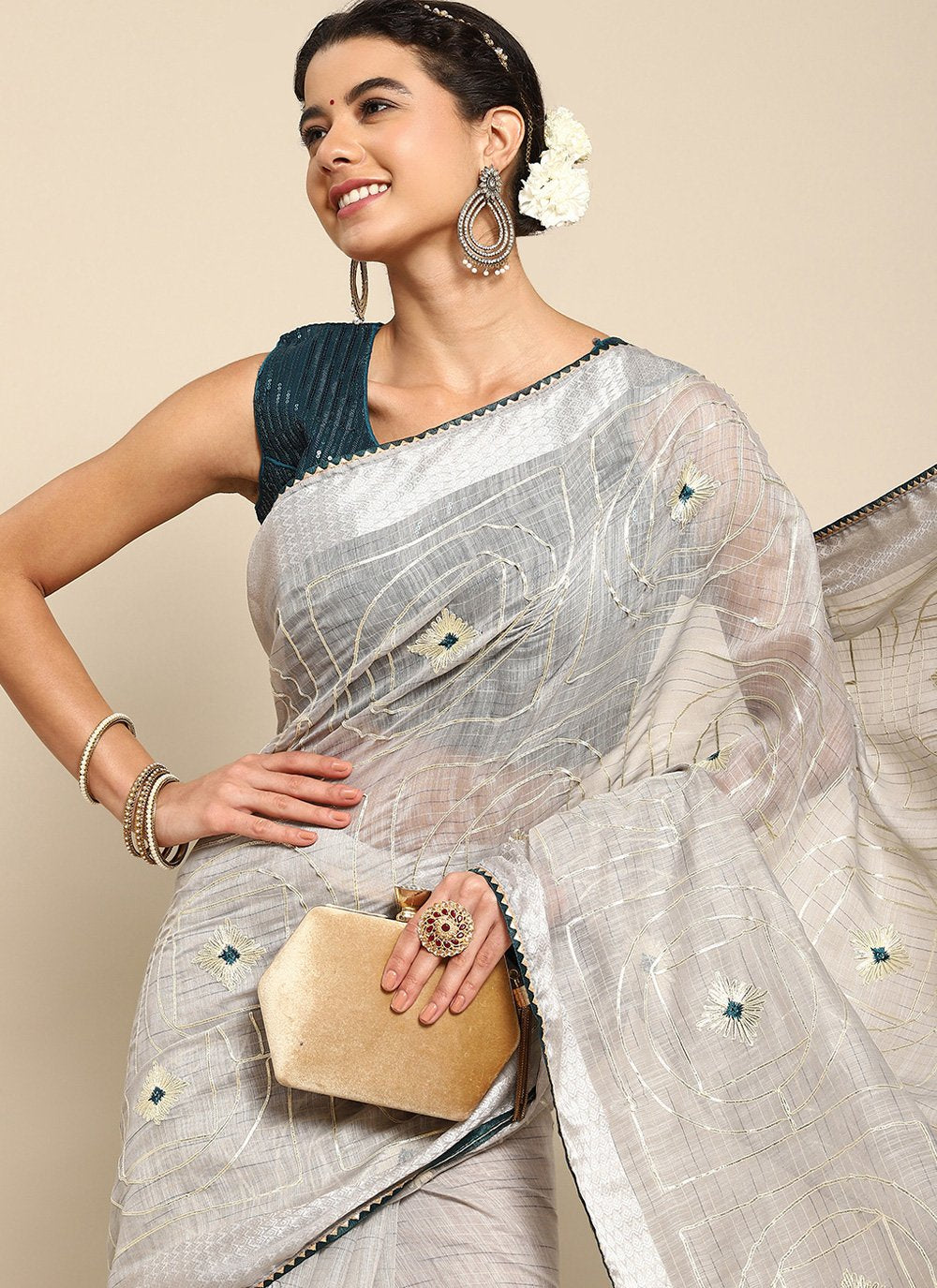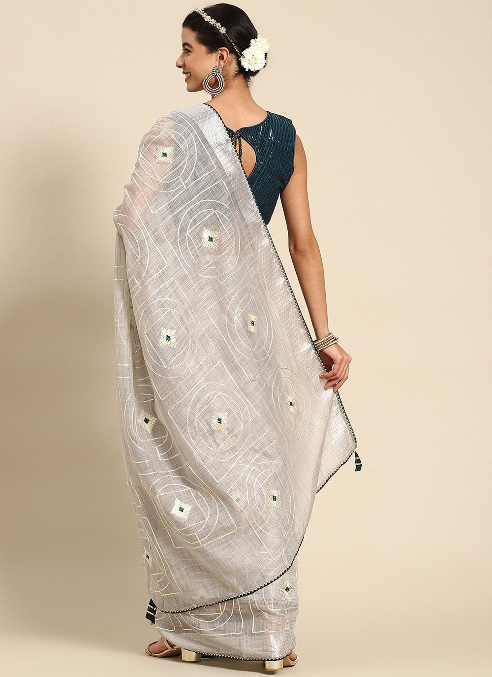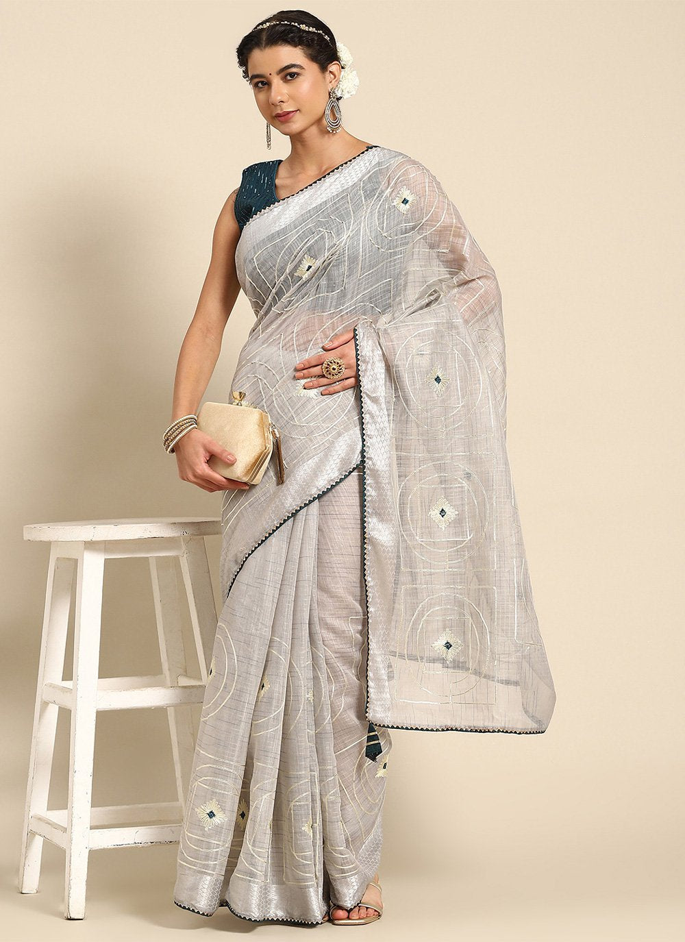 Classic Poly Cotton Grey Embroidered Saree