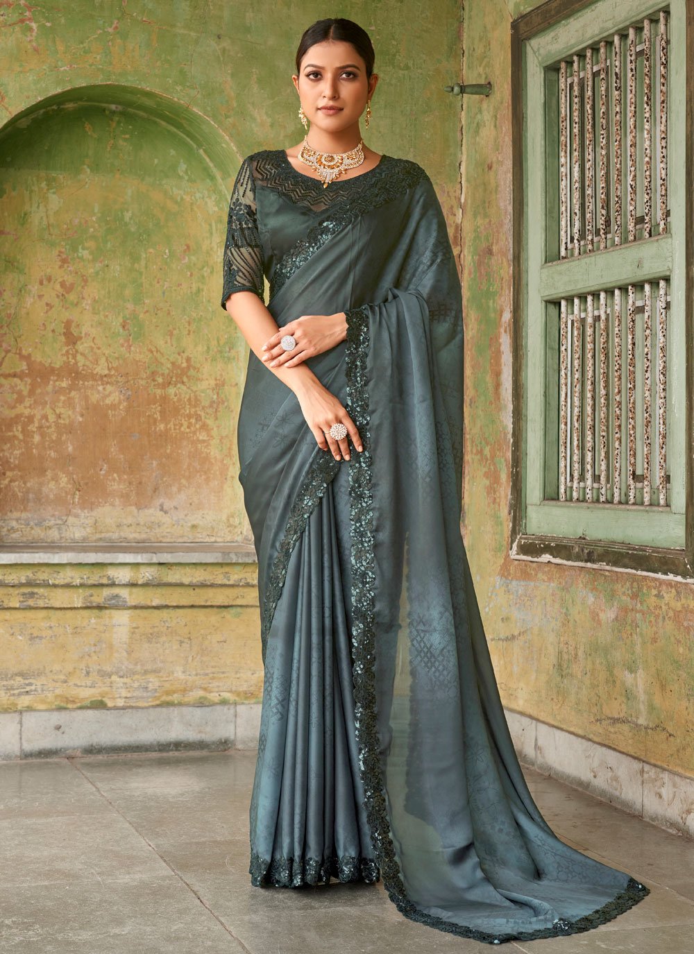 If you are a diva who loves to turn heads wherever you go and this delightful drape is a must have item for your closet. Fashion and trend will be at the peak of your magnificence the moment you dresses this grey satin classic saree. This engaging attire is displaying some amazing embroidery done with embroidered and lace work. Comes with matching blouse. (Slight variation in color, fabric & work is possible. Model images are only representative.)