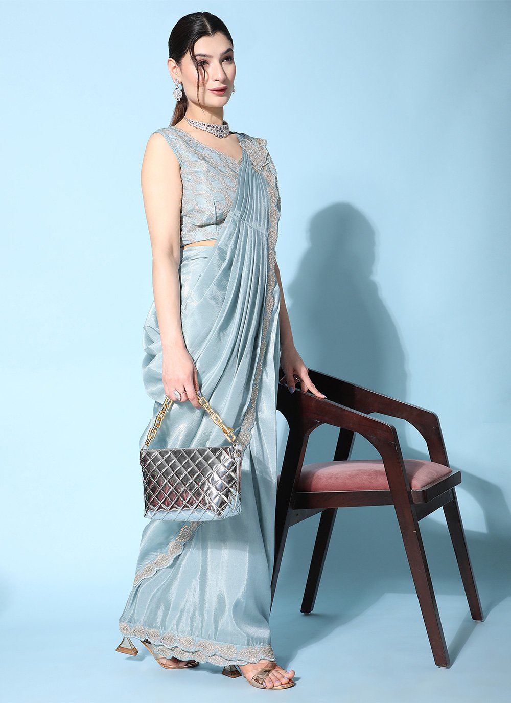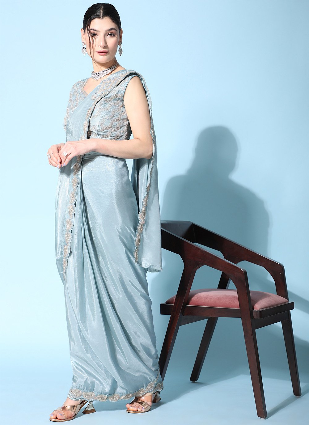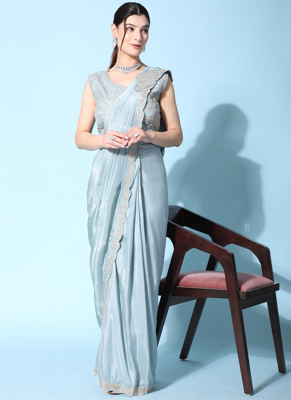 We have ensemble a symphony of enchanting piece to restyle your senses. Make the heads flip as soon as you costume up with this charming aqua blue silk classic saree. The brilliant dress creates a dramatic canvas with fantastic embroidered and sequins work. Comes with matching blouse. (Slight variation in color, fabric & work is possible. Model images are only representative.)