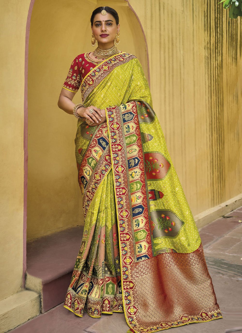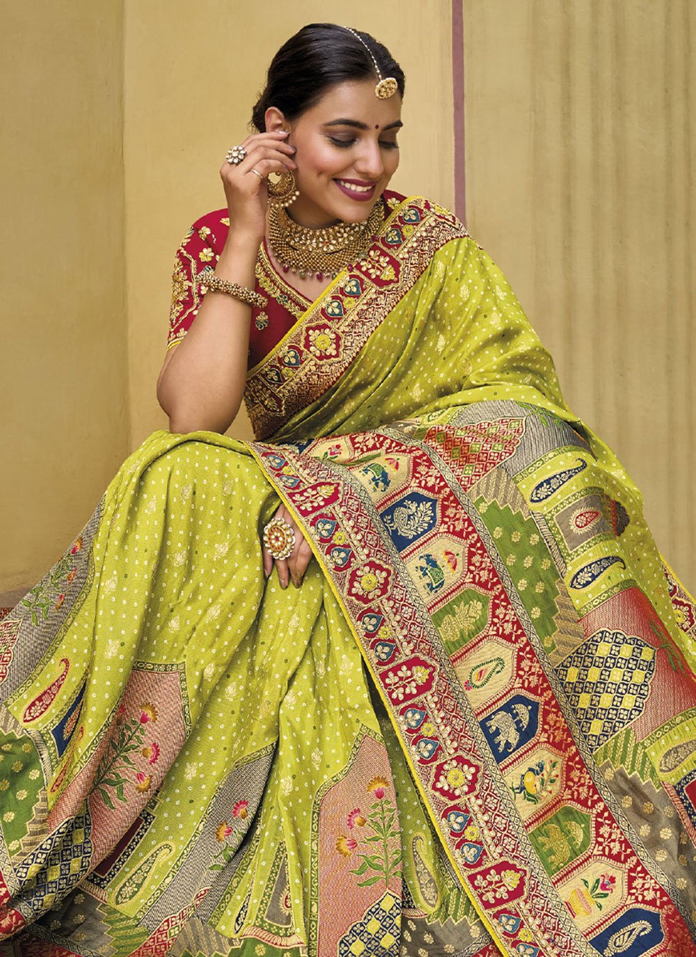Vogue and pattern would be on the peak of your beauty as soon as you attire this green silk saree. Look ravishing clad in this dress that's enhanced border, embroidered and lace work. Comes with matching blouse. (Slight variation in color, fabric & work is possible. Model images are only representative.)